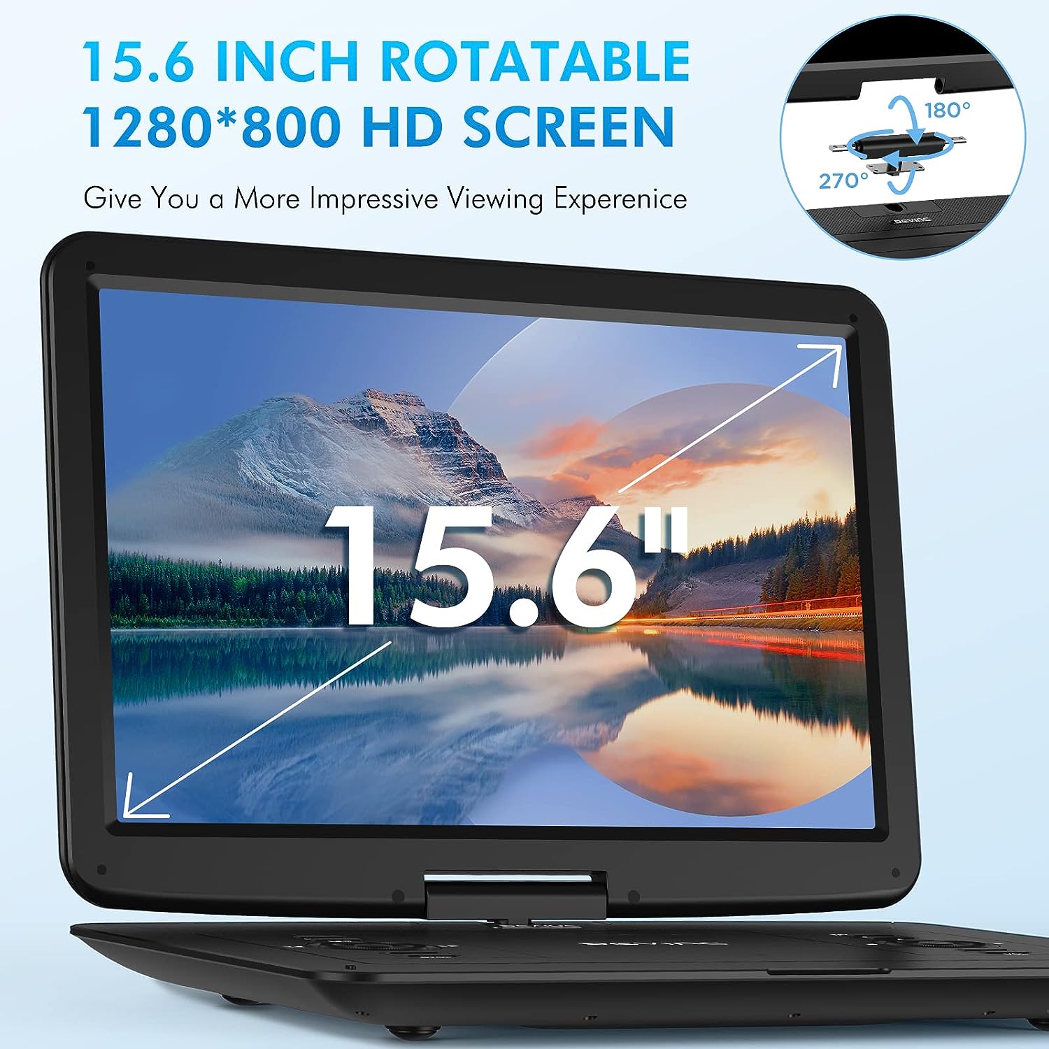 - 【Swivle Screen】This 15.6" portable DVD player has a 270-degree rotation and 180-degree flip,you can swivel the screen with ease to a comfortable viewing angle. Perfect for traveling in your car and entertaining children.